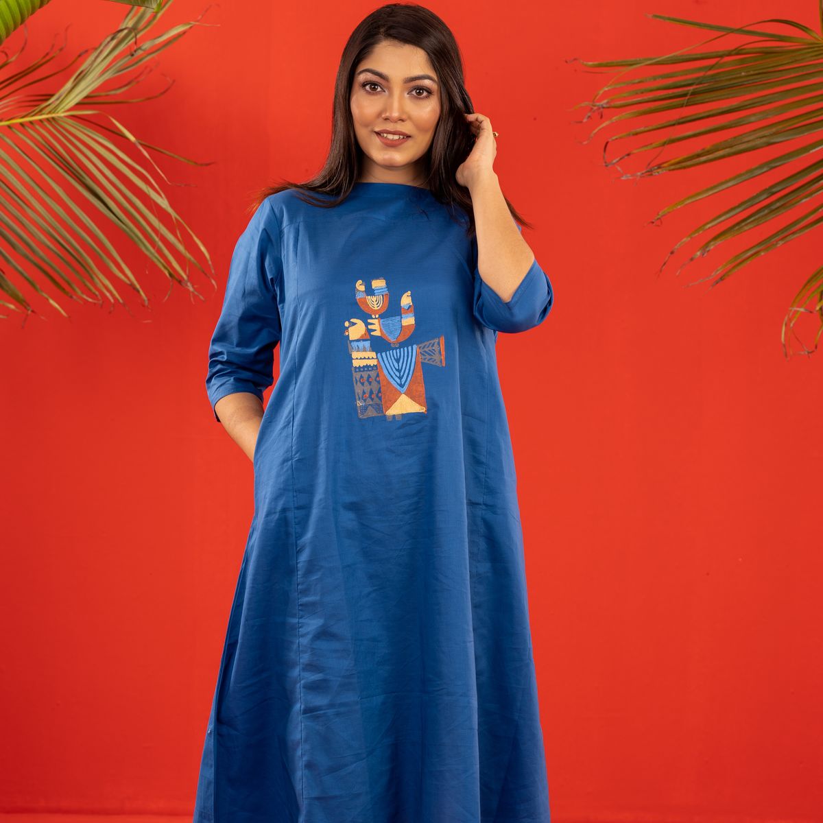 Minimal A line kurti with our moyur doodle printed. It's light weight and airy, perfect for work or casual events.